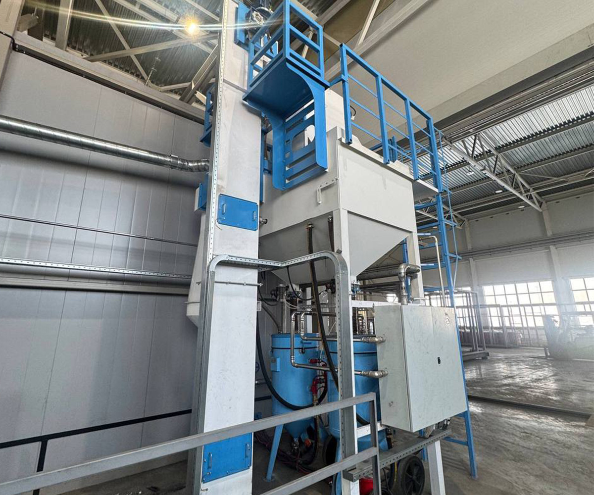Модуль дробеструйной очистки мелким абразивом имеет внутренние размеры 16000х7000х5000 мм. Персонал попадает в модуль через две двери для сервисного обслуживания размером 800х2000 мм каждая. Для освещения предусмотрены 14 светильников. Изделия располагаются на напольных конвейерах. В модуле 2 конвейера длиной 1420 мм и 1 конвейер длиной 1220 мм. Для перемещения абразива предусмотрен поперечный шнековый конвейер, ковшовый элеватор. Дробь подается через 2 напорных резервуара. Абразивный материал собирается и очищается с помощью 2000 - литрового силоса для дроби с вытяжной отбойной перегородкой. Модуль оснащен системой вентиляции мощностью 25 тыс.м3/час. Персонал управляет режимами работы камеры через сенсорную панель. Модуль оснащается системами автоматики, системами пневматики. Поставляется вместе с расходными материалами в двойном количестве - шлангами длиной 20 метров, соплами, защитной одеждой для рабочего персонала.